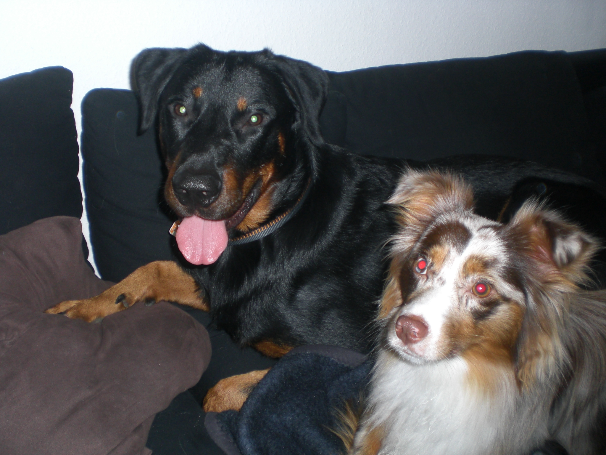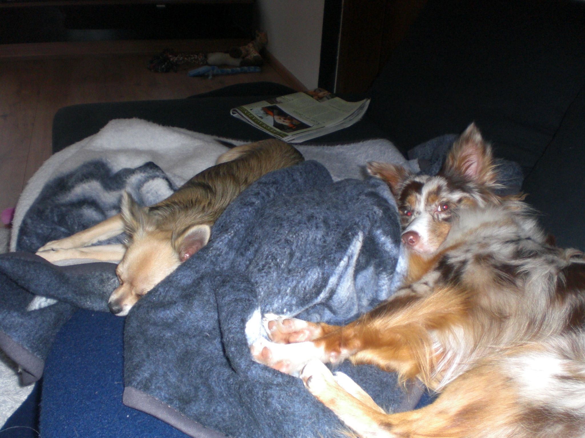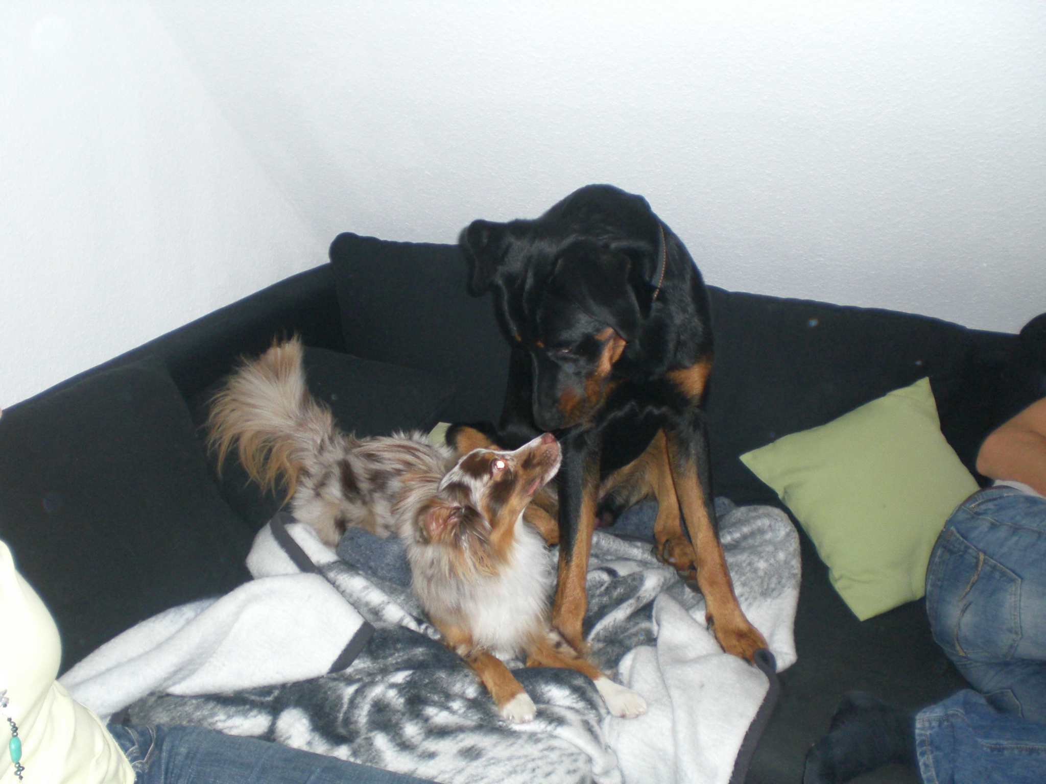 Heute waren Celi und Athos bei uns zu Besuch. Das war ganz schön komisch, Athos ist ja viel zu groß für unsre Wohnung *haha* Zuerst hab ich mich mal schön unter dem Tisch versteckt und ihn angeknurrt-hat ihn aber nicht gejuckt. Naja, dann hab ich mir einen Ruck gegeben und dann haben wir richtig toll gespielt. Zum Schluss waren wir beide total platt und haben uns auf die Couch gelegt....Naja, die Couch war dann voll! :-)